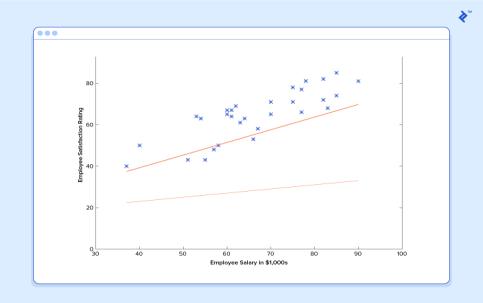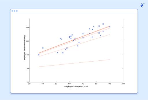 At this point, if we repeat the process, we will find that and won’t change by any appreciable amount anymoreandthusweseethatthesystemhasconverged. Ifwehaven’tmadeanymistakes,thismeanswe’vefound the optimal predictor. Accordingly, if we now ask the machineagainforthesatisfactionratingoftheemployee whomakes$60k,itwillpredictaratingofroughly60.