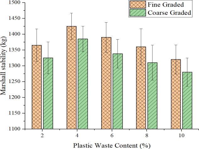 a) The Marshall Stability (MS) for both fine and coarse graded plastic wastes increases with increase in plastic waste content upto 4% beyond which the MS values start decreasingwithincreasingplasticcontent.