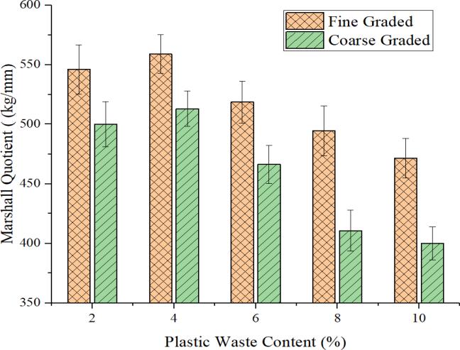 a) The MQ for mixtures containing both fine and coarse gradedplasticwasteparticlesincreasestill4%plasticwaste content after which it starts decreasing with increasing plasticwastecontent.