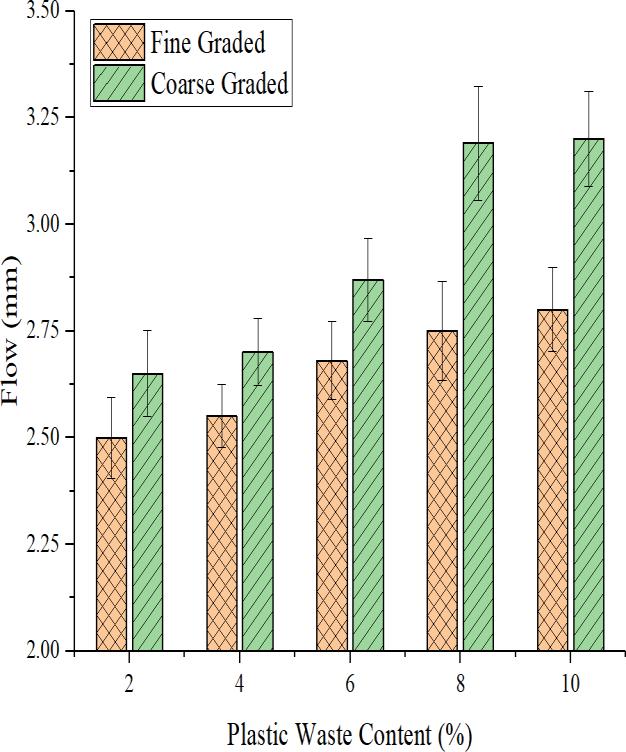 b) It can be observed that, for any plastic waste content valueforthemixturescontainingfineplasticwasteparticles, and the mixtures containing up to 6% of coarse graded plastic waste particles, the flow is lower than that of the controlmixturewith0%ofplasticwastecontent,indicating thatinclusionofplasticwasteincreasesthestiffnessofthe mixtures.