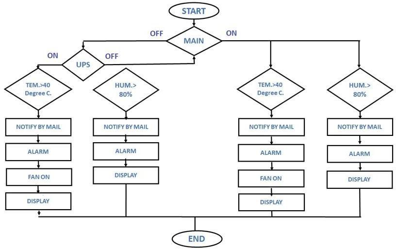 Results: Resultsonhardwareaftertheoperationofmainspower monitoring. Fig1FirstReadingonhardwarewhenmainspowergoes down Fig2SecondReadingonhardwarewhenmainspower supply Fig3ServerroomalertreadingviaGmail Fig4SoftwareFlowchart