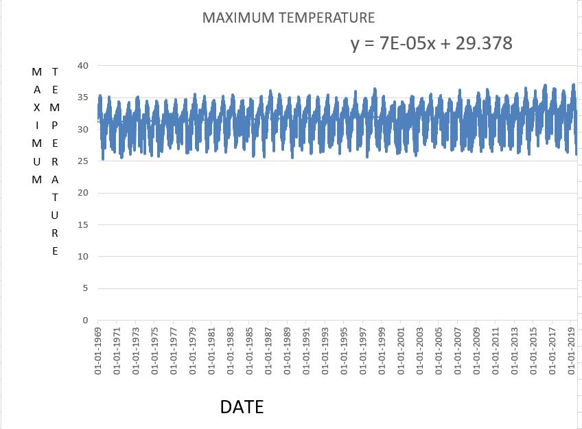 Trendlineofmaximumtemperature timegraphindicates that there is was a gradual increase in maximum temperatureinthepastfiftyyears.