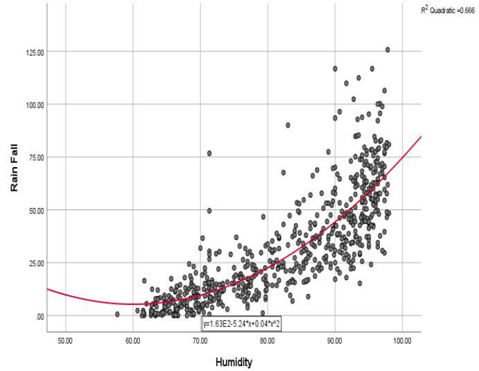 Here the significance value is 0.000 which is less than 0.05. Hence, we can conclude that there is a significant impact of relative humidity on average rainfall. The regressionequationis,��=1.63��2−5.24��+0.04.