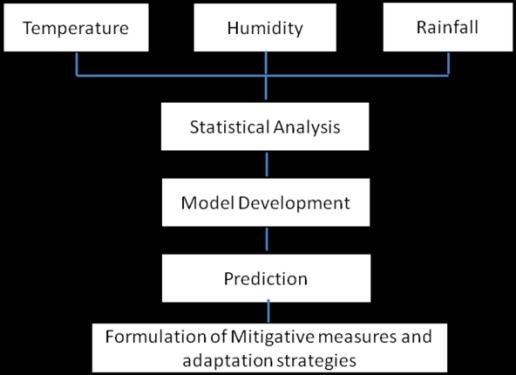 To formulate an equation connecting temperature, humidity and rainfall based on statistical data. The regressionequationconnectingthesethreevariablesis, �� = − 164. 354 + 1. 900ℎ + 1. 214 where �� is the average rainfall, ℎ is the relative humidity and �� is the maximum temperature.