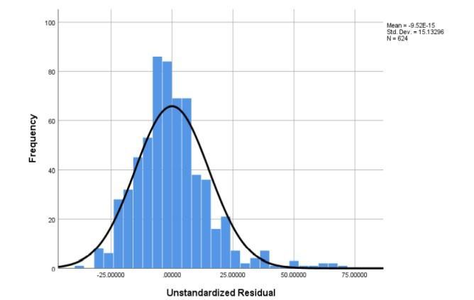 From this histogram we can conclude that the residual values are concentrated near 0 more than expected. The graph shows a strict decline in frequency as the residual value changes from 0 which means that the predicted valuesareextremelygood
