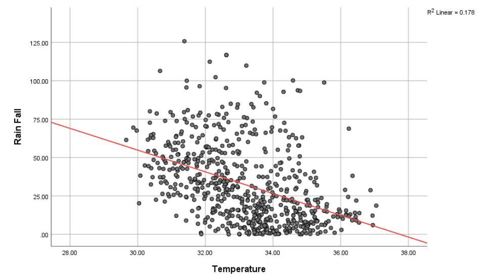 Fig 5.3.3 Scatterplotbetweentemperatureandrainfall