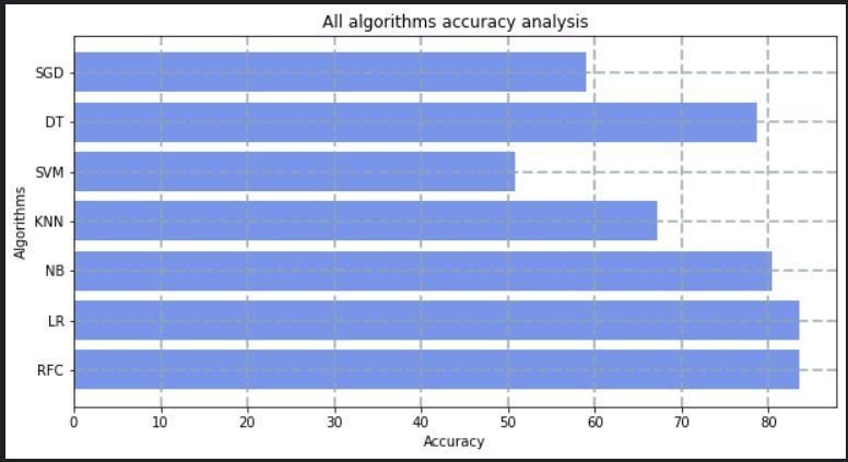 Several algorithms were implemented, Figure 10 shows comparison between them on basis of accuracy. Hence consideringaccuracytwomostprominentalgorithmswereshortlistedanddeployedmentionedbelow: