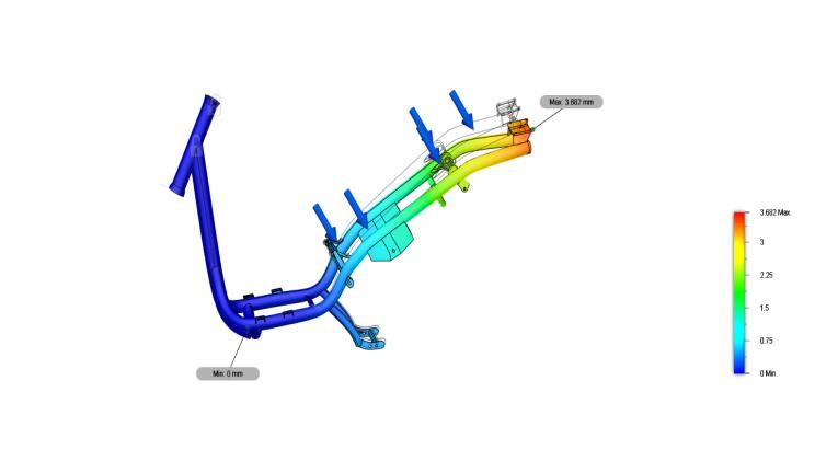 However, the trends and behavioral information obtained from a basic or fundamental study can often be used to predictandimproveadesign.Youmaysignificantlyimprove the whole engineering process by performing this basic analysis early in the design phase.Use the analyses in theSimulationworkspace to determine how loads lead to deformationandfailure,soyoucanunderstandifandhowa part will fail. Or you can determine natural vibration frequencies to avoid resonance. You can identify temperaturedistributionsandthermallyinducedstresses[8] . Fig7:Totaldeformationofchassisusingfusion360software