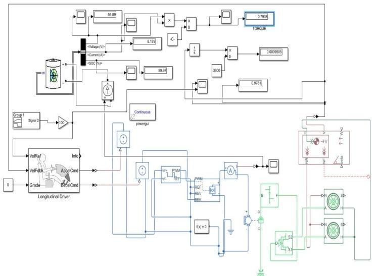 Beforefabricationandphysicaltestingofthenewvehicle,we shouldhaveanideaabouttheparametersthatwegetforit liketherange,stateofcharge,voltageandcurrent.Forthis purpose,weusetheMathlabsoftware.Basedonthevalues obtained from the calculations on proceeding with the software simulations the torque obtained is 0.7938 N m. Theseconditionsdidnotmatchtherequiredoutputhence based on the requirement of the vehicle and for smooth functionofthevehiclesomemodificationsweremadeinthe parametersobtained[19]