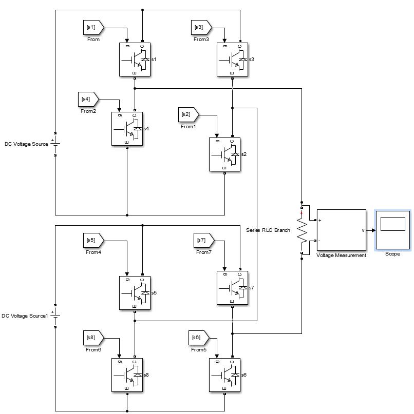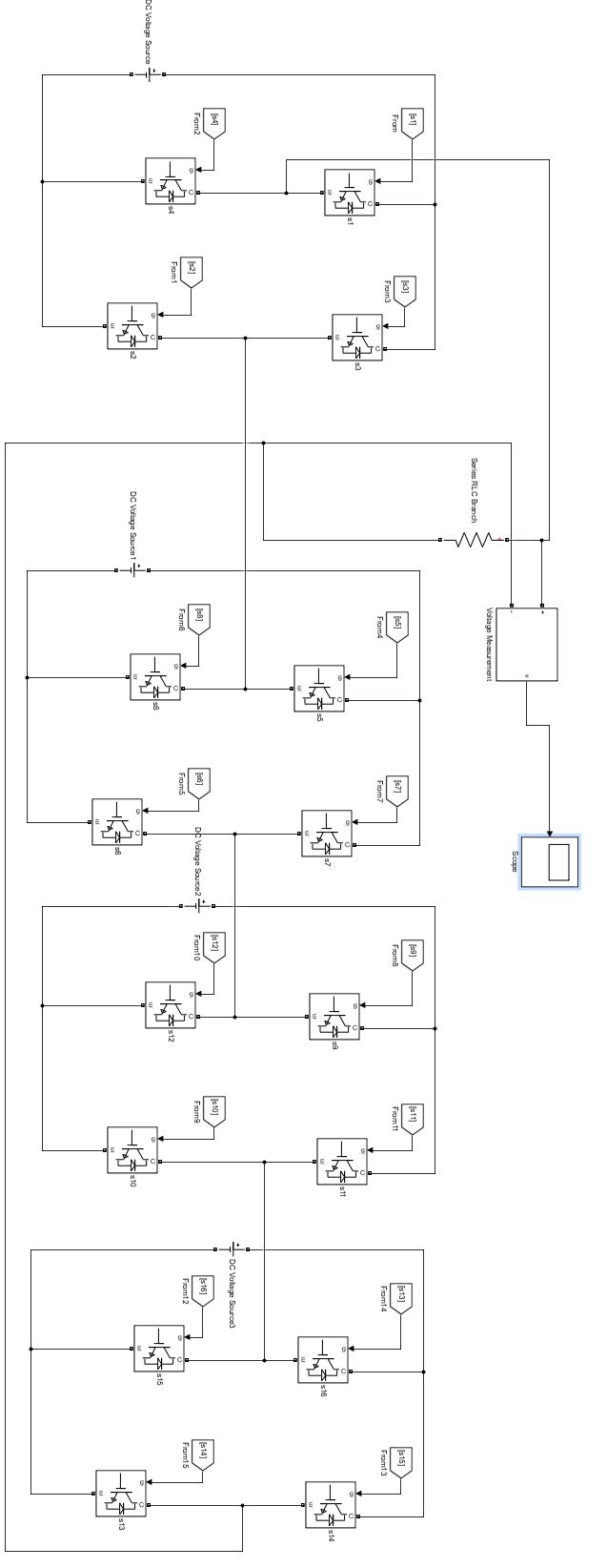 Fig. 7 shows single phase cascaded H bridge multilevel inverter consisting of three H bridges with 16 IGBT switches, three dc sources (V=100) and R load (R=10). In this configuration, sixteen IGBTswitchesare(s1,s2,s3,s4,s5, s6,s7,s8,s9,s10,s11,s12,s13,s14,s15,s16)used.FourH bridges are connected in series to generate nine levels of output