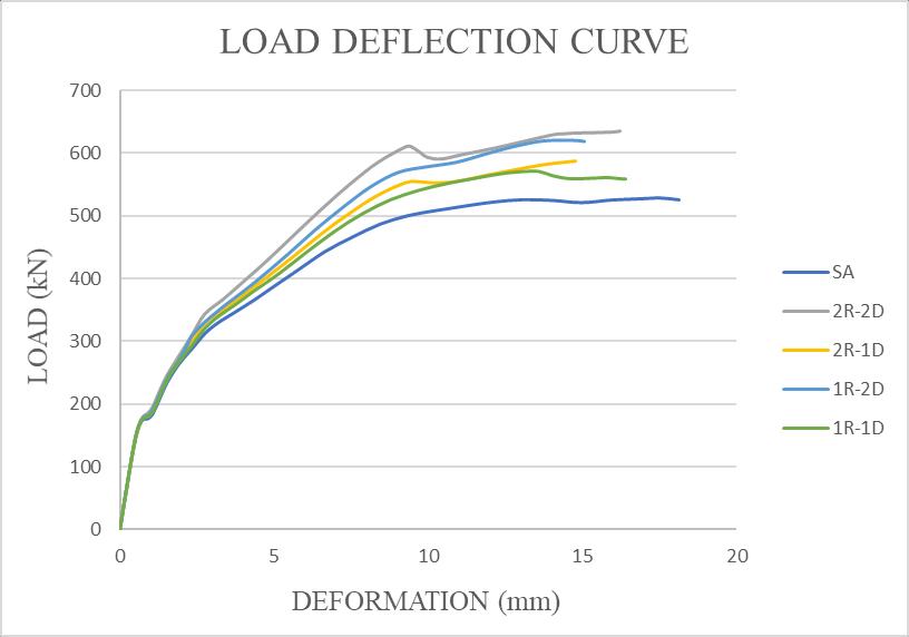 TheChart1representstheloaddeflectioncurveof bubble deck slab in RA and SA. The Chart 2 represents the load deflectioncurveofbubbledeckslabinSAwithandwithout CFS.