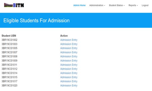 Theworkiscarriedoutbyadmin.Hereinthestudentstatus admincanviewthedetailsoftheeligibleandnoteligible studenttheeligiblestudentwillbeenrolledforthefurther process and admin can view the student who are not eligiblefortheadmission.