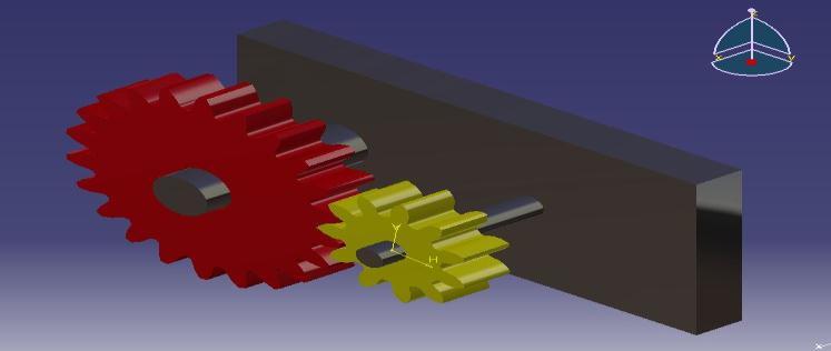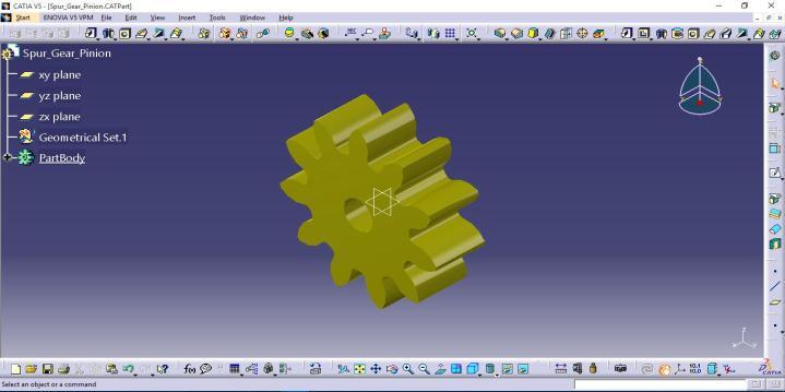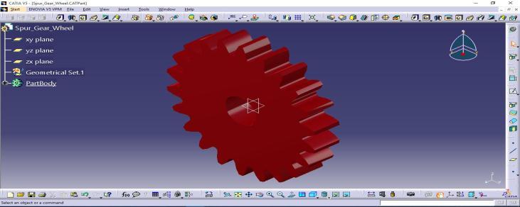 The data obtained from the calculation and table 3 and table 4gearwheelandpinionweredesignedwiththehelp ofmodellinganddraftingsoftwareCATIAV5.Figure 2and Figure 3 represent the 3 Dimensional part models of the Gearwheelandpinion.Figure 4andFigure 5representthe assemblymodelsofgearandpiniontogether,showingthe teeth are in mesh. In Figure 5, a rectangular block is provided,whichmakesitsimilartoagearboxarrangement where the shafts are enclosed in the common box like structure.