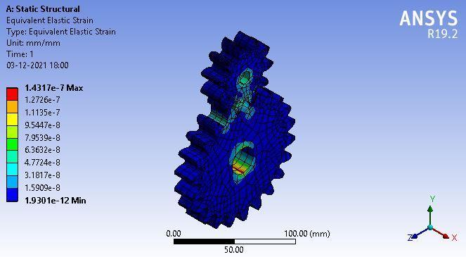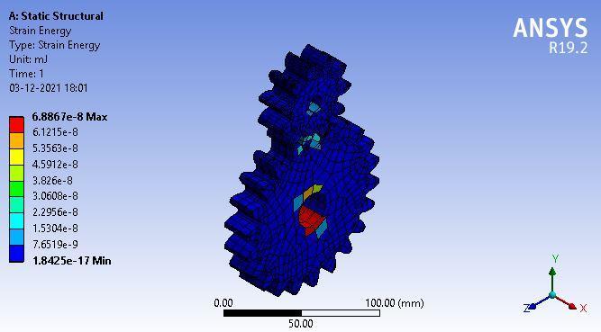 Loadingisgivenasamoment,andthecorrespondingresults are noted and tabulated. Loading starts by applying a momentof50N mmandloadsprogressbyadding50N mm untilthevalue1000N mmisattained.Strain,StrainEnergy, Deformation, and Stress are the main parameters noted. Tables5and6givethedataofappliedloadormomentand itscorrespondinganalysisvaluesregardingstaticstructure. Figure 8,9,10,11representsthestress,deformation,strain energy,andstraindistributioncontourwhenthemomentis appliedonthelargergearwheel