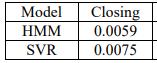 In both the HMM and the SVR implementations, the projected values are shown for Close price closely track the patterns displayed by its corresponding real values, and the MAPE values were also found to be comparable. The SVR model's predictions were not confirmed by jarring changes in the stock price. However, it was discovered that the HMM based model was extremely susceptible to changes in stock price. This conclusion is alsoinlinewiththescatterplotofthepredictionerrorfor each day for both models, where the distribution of the error points was seen to be more dispersed around zero fortheHMMandconcentratedaroundzeroforSVR.Figure 6 displays the HMM prediction for the next four days for thestockTATAMOTORS.