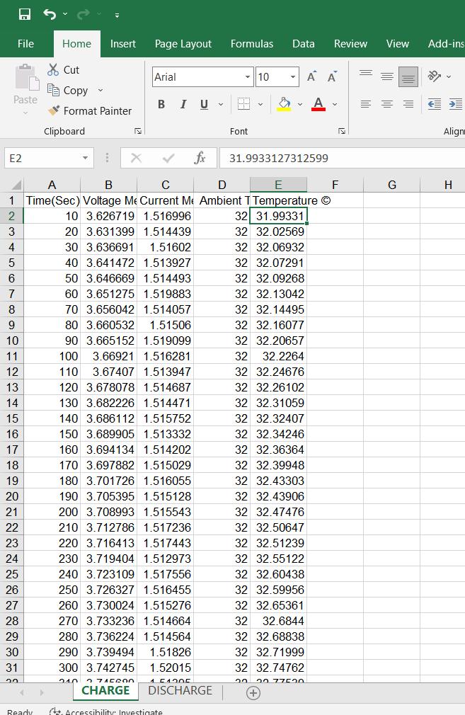 iii. The temperature at which the entire setup was beingperformedwas32°Croomtemperatureor ambient temperature. We observed that with the rise of current, the temperature gradually rosefrom32°Ctoasmallamountof34°Catits peak current and then the temperature subsided gradually. But the temperature rise during discharging was rapid as a constant currentof1amperewasbeingabsorbedbythe load continuously, which led to a rise in temperatureto36°C.