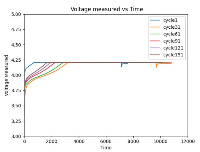 Chargingwascarriedoutinaconstantcurrent(CC)mode at1.5Auntilthebatteryvoltagereached4.2V,whichisthe thresholdvoltage,andthencontinuedinaconstantvoltage (CV)modeuntilthechargecurrentdroppedto20mA.The voltagemeasuredacrossthebatteryincreasesslowlyineach cycle. However, because the battery cannot maintain its initialvoltagevaluewitheachcycle,weobserveavariation in the starting level of the voltage (as after one complete cycleofdischarge,someamountofenergyisstoredwithin thebattery)Thechargingvoltageisslightlygreaterthanthe currentmeasuredduetosomedropassumed.Theamountof timetakenforfullychargingthebatteryisaspecifictime(1 hr)afterthebatteryenterstheCVmodeofcharging,usually whenthecurrentreaches10percent