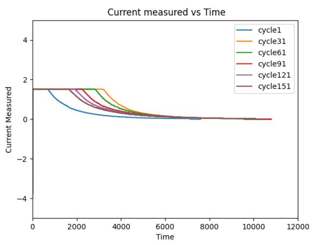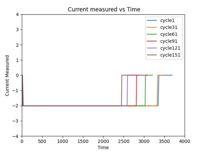 Thebatterywasdischargedataconstantcurrent(CC)of 2A until the voltage dropped to 2.7V. Since the battery's capacityis1.9Ahr,thebatteryisdischargedat1.1Cinthis situation.Inthegraphsshownbelow,weobservethatwith the passing of cycles, the rate of discharge increases, suggestingthatthecut offvoltageisreachedsooner,which isanindicationthatthebatteryisgettingolder.Oncethecut offvoltageisreached,thebatterycannotbedischargedany furtherasit'scriticalforthebattery'slongevity.Discharging ofabatterytakesplacewhenthebatteryisconnectedacross theload.Thevoltageacross theloadisslightlylessdueto the drop across the circuit and battery back emf with a constantcurrentof2Aappliedthroughout