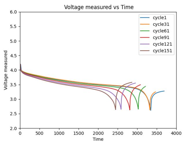 ThefollowingdatasetwasparsedinPython3.9usingthe SciPy library and the following characteristics were observedduringchargeanddischargeofBatteryno.5across atotalof164cycles.Graphswereplottedatintervalsof30 cycles to get a clear idea of the distinct nature of the characteristicswiththepassingcycles.