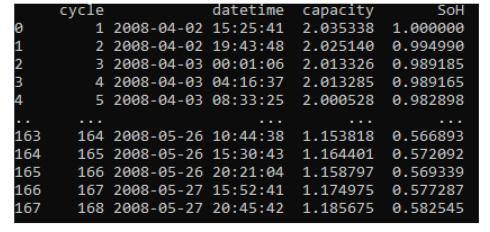 According to the README file of the dataset, the data is stored in several ".mat" files. Each file corresponds to a specificbattery,andthedatastructureofeachfilecontains the parameters mentioned in the above section. For the LSTMmodel proposedinSectionV,itisonlynecessaryto collectthedatarelatedtothedischargeofthebattery.For this, a function is created in Python that is in charge of reading this data from the ".mat" file and storing it in memoryintwopandasDataFramesforlateraccess.After loadingthedataset,adescriptionofthedataismadeusing pandasfunctionstoverifyifthedataloadingwascorrect.