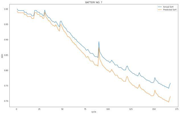 Inthisexperiment,thedischargedataforall164cyclesfrom batteryNo.5wereemployed.TheSoHwascalculatedfrom theinitialcapacityasbeing1.9AHr.Theresultisconsidered to be a long term SoH estimation of the battery. The followinggraphsshowtheperformanceofbatteryno.6,7, and18usingacomplexDNNalgorithm(LSTM).Thex axis representsthecycles,andthey axisrepresentstheSoH.The bluelineintheplotrepresentstheactualSoHandtheorange linerepresentsthepredictedSoHbythemodel.