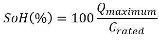 Duetotherestrictedmanufacturingprocess,theactualfull capacity of a new battery may differ from the nominal batterycapacityclaimedbythemanufacturer.Asaresult,a newbattery'soriginalmaximumcapacity,Qf,iscalculatedby averaging the full capacities of multiple charging/dischargingcycles.Whenabatterybeginsacyclic charging/discharging operation, the inevitable aging will lead to performance deterioration, with a decrease in the maximum chargeable or releasable capacity, QM, which is acquiredbycumulatingthebatterychargeseitherfroman empty to full or full to empty operation[5]. The "state of health" of a battery describes the difference between an examinedbatteryandanewbattery,takingintoaccountcell ageing. It's the ratio of a battery's maximum charge to its ratedcapacity[6]