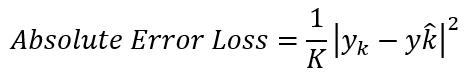 Absoluteerrorsmeasuredthemeanabsolutevalueofthe difference between the elementwise inputs. The absolute errorformulausedasthelossfunctioncanbeexpressedby thefollowingequation: