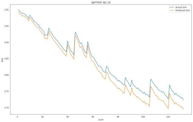 Itisclearlyshowninthefiguresthatduetotheaccurate fittingofthetrainedDNNmodelwithbatteriesno.6,7and 18,theLSTMmodelissuccessfullybuiltandtheRMSEofthe SoH estimated by the proposed model is much less as comparedtoothertraditionalmachinelearningalgorithms.