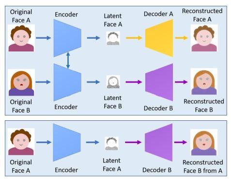 Fig3:Encoder Decoderpair.Tocreatedeepfake2pairsofencoderanddecoderareused.Infirstpairoriginalfacesare encodedandinsecondpairFaceofAisdecodedwithfaceofB.[3]