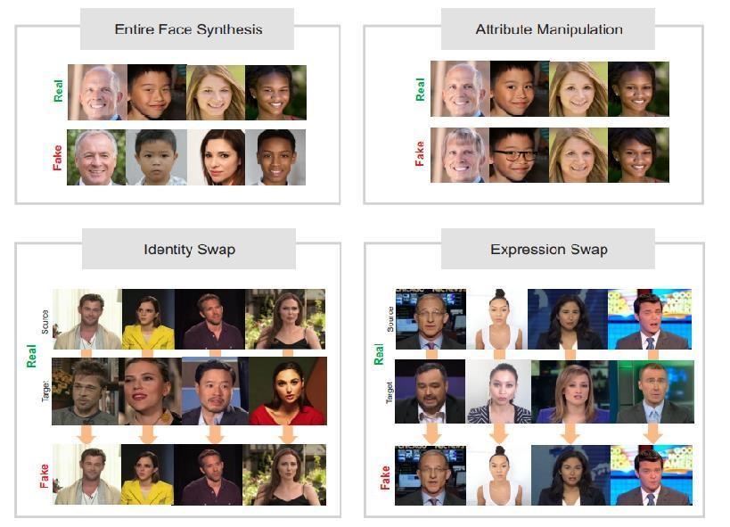 Dependinguponthelevelofthemanipulation,thefacialmanipulationscanbeclassifiedintofourcategories:namely, 1] EntireFaceSynthesis2]IdentitySwap3]AttributeManipulation4]ExpressionSwap