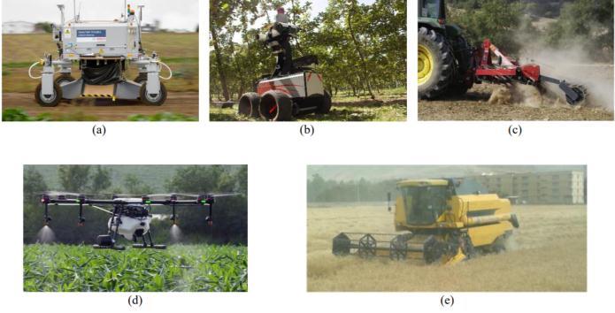 Figure ii1. iiAgriculture iirobot iiand iimachineries ii(a) iiBoniRob ii[23] ii(b) iiShrimp iirobot ii[24](c) iiChisel iicultivator ii[25] ii(d) iiDJI iiAGRAS iiMG 1S iiDrone iisprayerii[26](e)iiCombinediiharvesterii[27]