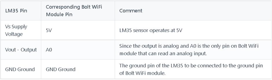 The iiLM35 iisensor iiin iiour iisystem iidetects iithe iitemperature iiof iiits iisurroundings iiand iicreates iian iianalogueiioutputiivoltage iibasediioniiits iivalue. iiThe iiLM35'siianalogueiivoltageiiisiitheniifediiintoiitheiiBolt iiA0iipiniiasiianiiinput.iiTheiiBoltiitheniiconvertsiithe iianalogue iivalue iito iia iiten bit iidigital iinumber iibetweenii0iiandii1023.iiTheiiBoltiideviceiisendsiithis iidigitaliidataiitoiitheiicloud.