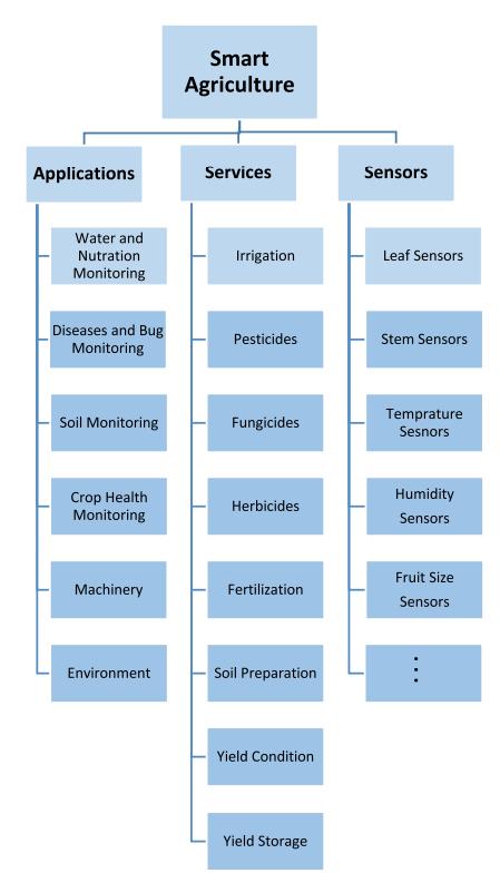 Every iiaspect iiof iitraditional iifarming iiprocesses iican iibe iisignificantly iitransformed iiby iiincorporating iithe iilatestiisensoriiandiiIoTiitechnologiesiiintoiiagricultural iipractices iiCurrently, iithe iiseamless iiintegration iiof iiwireless iisensors iiand iithe iiInternet iiof iiThings iiin iismartiiagricultureiicaniitakeiiagricultureiitoiipreviously iiimagined iiheights. iiIoT iican iihelp iito iienhance iithe iianswers iito iimany iitraditional iifarming iichallenges, iisuchiiasiidroughtiiresponse,iiyieldiioptimization,iiland iiappropriateness,iiirrigation,iiandiiinsectiimanagement, iiby iiimplementing iismart iiagriculture iimethods. iiA iihierarchy iiof iiimportant iiapplications, iiservices, iiand iiwireless iisensors iiutilized iiin iismart iiagriculture iiapplications iiis iishown iiin iiFigure ii3. iiIntegrating iiMachineiiLearningiiiniithisiiarchitectureiiwilliinotiijust iiinform iius iiabout iithe iistated iiproblems iibut iialso iihelp iius iimonitor iithe iicrop iiand iifollow iithe iidata iiandiipredictiihowiitheiicropiiwilliiperformiibutiialso iiprovideiisolutionsiiwheniianyiiirregularitiesiioccur.ii iiiiiiiiiiFigureii3.ii