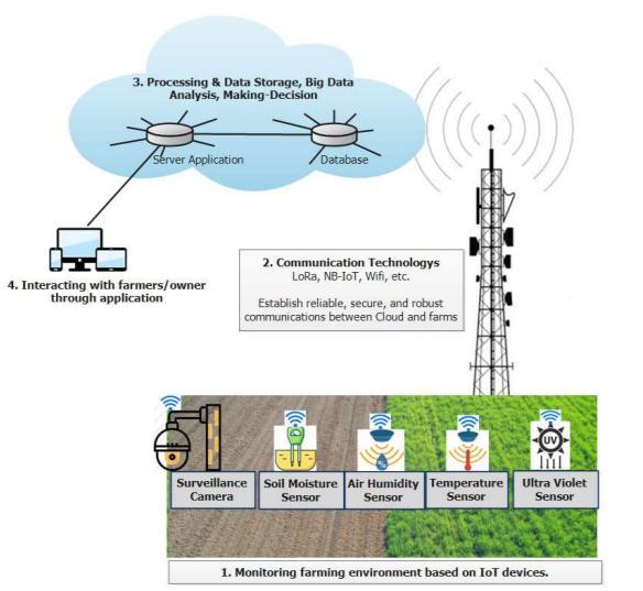 We iipropose iia iicommon iiarchitecture iifor iian iiIoT iiecosystemiiforiismartiiagricultureiiiniithisiipart,iiwhich iiisiimadeiiupiiofiithreeiikeyiicomponents:iiIoTiidevices, iicommunication iitechnologies, iiand iidata iiprocessing iiand iistorage iisolutions. iiFigure ii4 iishows iian iiillustration iiof iithe iiIoT iiecosystem iifor iismart iiagriculture.