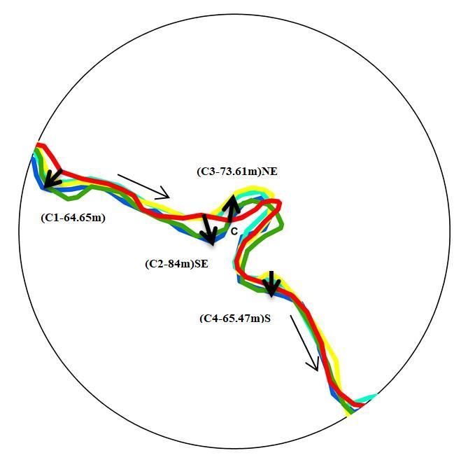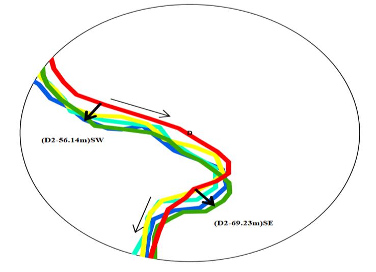 Most of the migration of the river channels has been observed near Mavaiya about at C2 84 meters towards the south west direction, Chakdwari at E1 71.18 meters in the north direction, and Galatha atpoint F 110.17 meters in the south east directioninrespectivelyvillages,andduringthelast38to45years,accordingtothisstudybasedonriverchannelmigration.