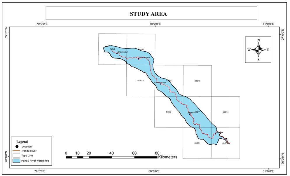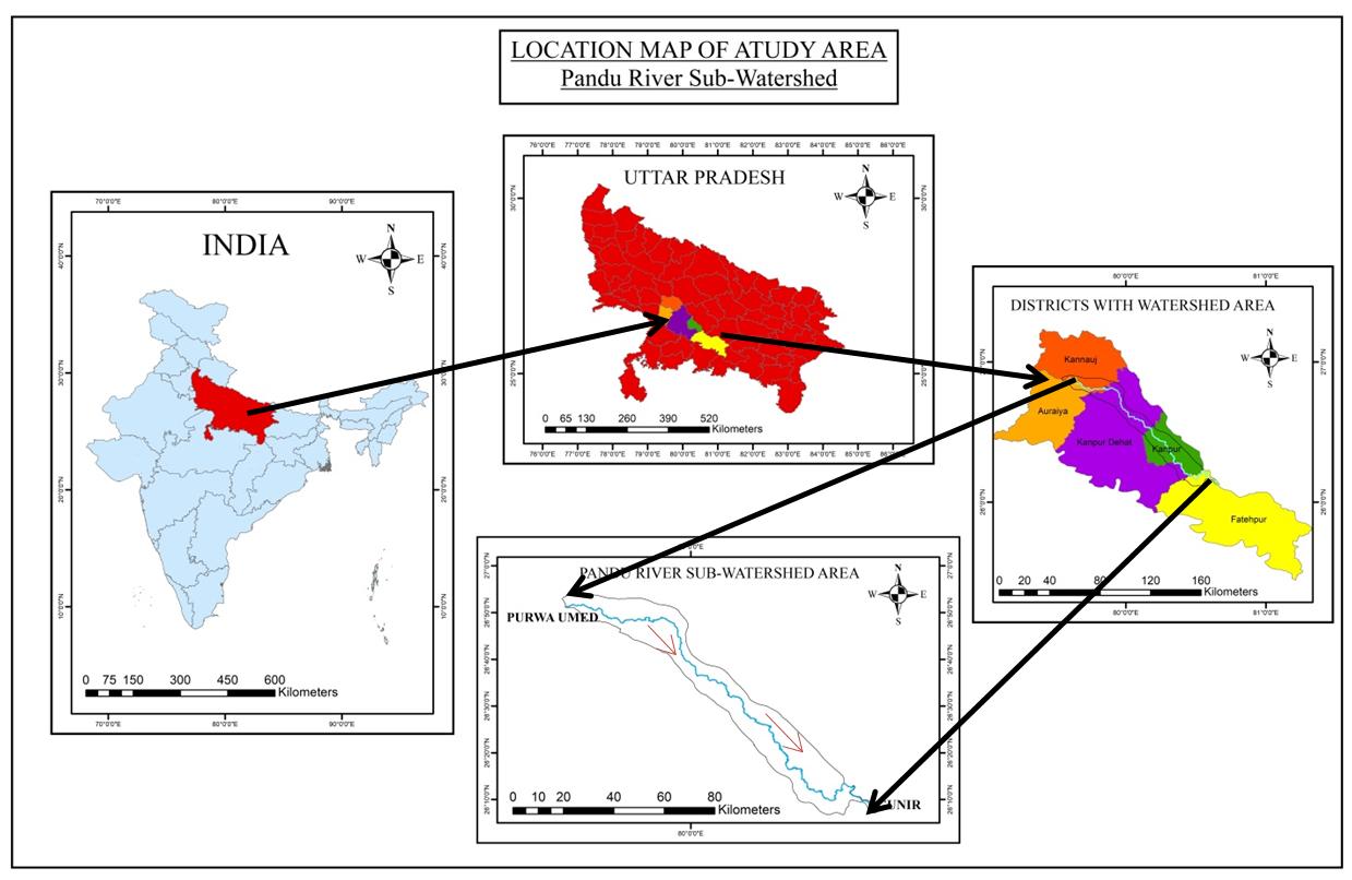 has a total area of 1721.3 hectares. At Gunir village in Fatehpur district, the Pandu river merges with the Ganga to form the Ganga.IntheUttarPradeshdistrictofFatehpur,theKanauj,Auraiya,Kanpurdehat, KanpurNagar,andeventuallytheGanga merge.ThePanduriverstretch,whichrunsbetweenlatitudes26°52'38.77"Nand26°9'50.08"Nandlongitudes79°32'31.68"E to80°35'49.03"Eandcoversfivedistrictsintheresearch,istheinterestofthearea(IOA)underinvestigation.