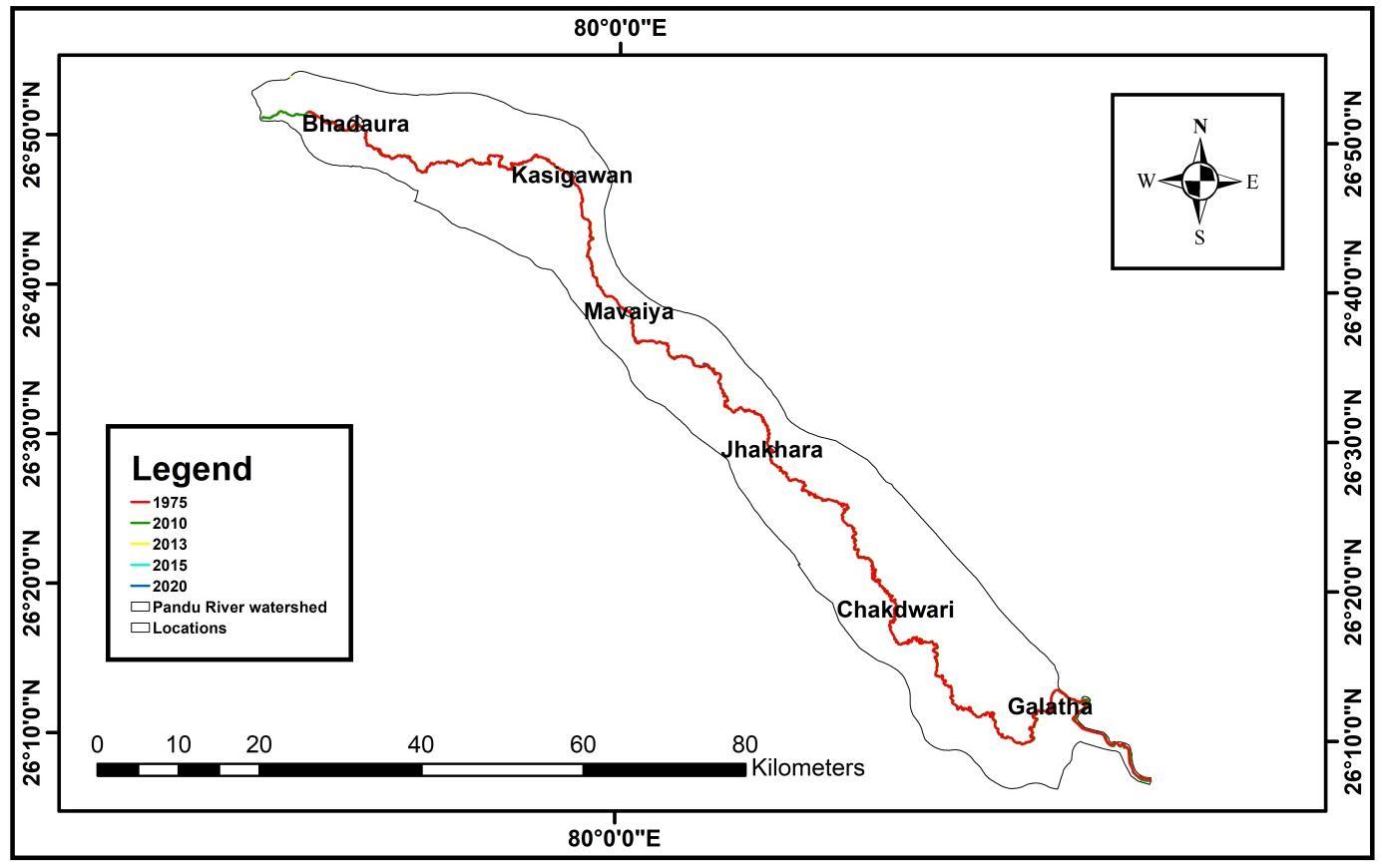Theinformationregardingthestudyareafortheyear1975wasextracted byusingSOI toposheetsacquiredfromtheNakshe portal,whicharepublishedbytheSurveyofIndiaatascaleof1:50,000.TheUniversalTransverseMercator projectionsystem in the world Georeference System (WGS84) data was used to georeference the toposheets. The Earth Explorer (https://earthexplorer.usgs.gov/) was used to download Landsat 8 (TM/OLI) satellite data for 2010, 2013, 2015, and 2020. We were able to identify the changes in the course of the river channel from 1975 to 2020 by overlaying different layers of riverchannelfromvariousyears,andwewereabletopinpointthelocationswherethe riverchannelmigrateddrastically.In thisriverchannelsearch,atotalof6locationsdemonstratesignificantmigrationinthestudyarea