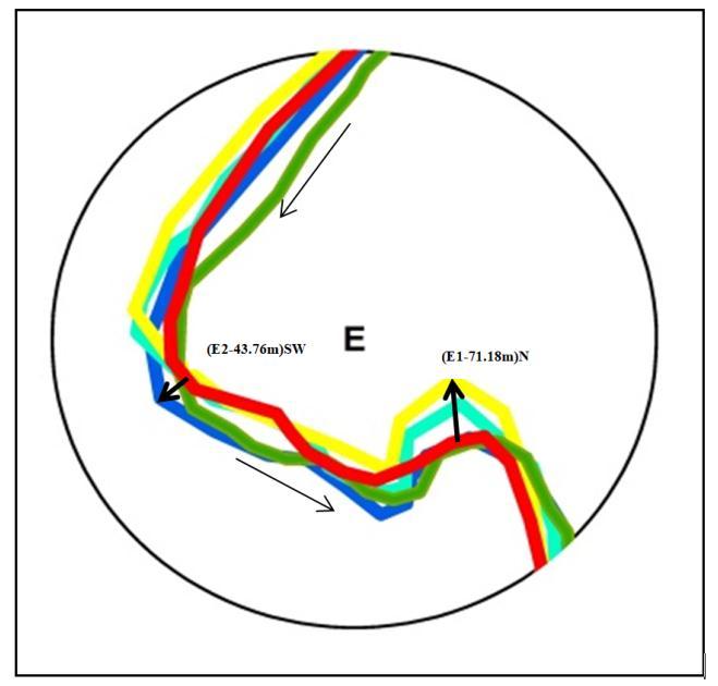 At point E, the Pandu river channel has migrated into two sub points, E1 and E2. From 1975 to 2013, the river channel migrated at Sub point E1 71.18 meters towards the north direction, and afterward, it migrated at Sub point E2 about 43.76 meters towards the south west direction from 1975 to 2020. Point E is situated near Chakdwari village in Kanpur district. Thereisanagriculturalareapresentonbothsidesoftheriverbank.Ifmigrationisnotundercontrol,thentherewillbemore chancesofsoilerosion.Andsoilerosionwillaffectallagriculturallandthatissituatedontheriverbank