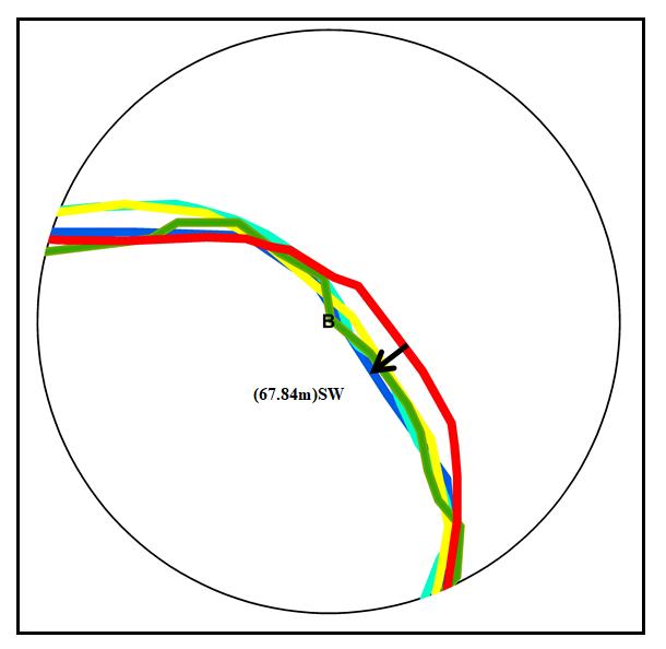 At Point B, the river path shifted around 67.84 meters From 1975 to 2020, the migratory trend at point B was toward the Southeast. Point B is located between Kherwa and Kasigawan villages near the boarder of Kanpur dehat and Kanpur Nagar districts.AtthispointofthePanduriver,thereisalotofagriculturefertilelandpresent.IfthePanduriverchannelmigratesin thefuture,therewillbechancesofsoilerosionanddamageofagricultureland