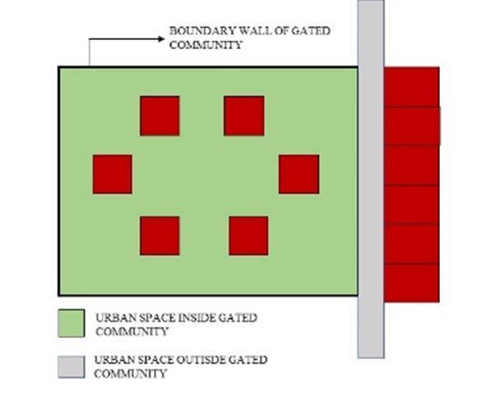 Inthecaseofneo liberalcitiestherearetwotypesofurban spaces in gated community that are formed: one which is inside the boundary wall and other on the outside of the boundarywall.Thestudylimitsitselftoassessmentofurban spaces surrounding the gated community. Two types of urbanspaceshavebeenidentifiedforanalysis(Fig1):