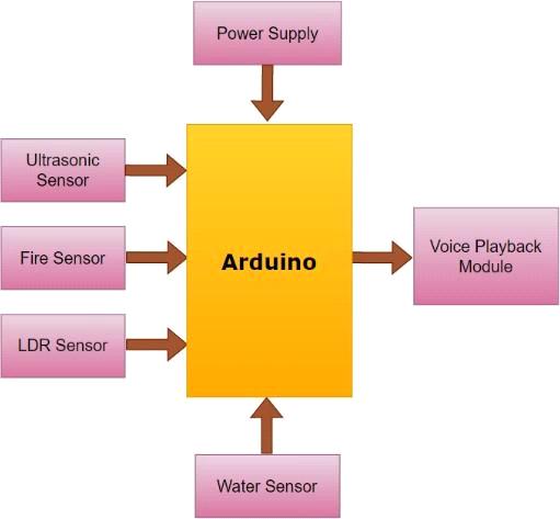 From the above displayed block diagram, the basic of the device working can be seen. We have Arduino Uno r3 as the processingcomponentofthisdevicealongwithitcanbeobservedthatwehaveapowersupplycircuitforprovidingregulated powertothecircuit.Thedevicealsohasavoiceplaybackmoduletoprovidevoice basedalertstotheusers.Thedevicehasa hostofsensorssuchasultrasonic,fire,water,LDRsensorsforprovidingalertsbasedondifferentscenario.AsshowninFig4.