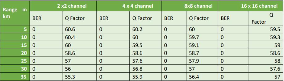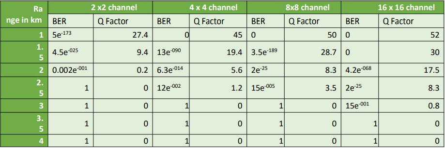 It shows that, the use of adaptive optimized channel increasestheQfactorvalueofabout25in2x2channeland withtheincreaseinlinkrange,16x16channelsshowsbest transmissionrateincomparisontootherMIMOchannels.
