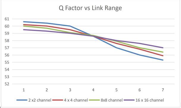 It shows that, the use of adaptive optimized channel increases the Qfactorvalueof about 59.12 in2x2channel andwiththeincreaseinlinkrange,16x16channelsshows best transmission rate in comparison to other MIMO channels.