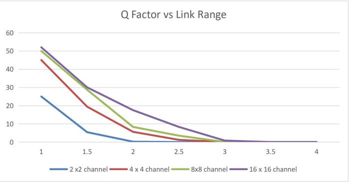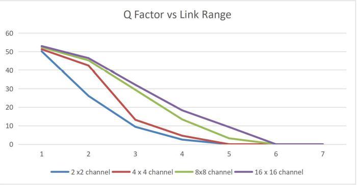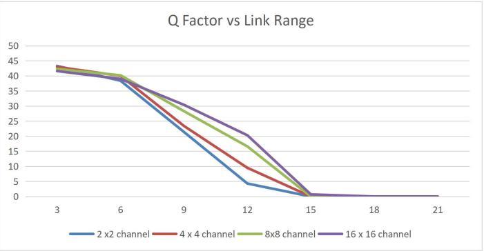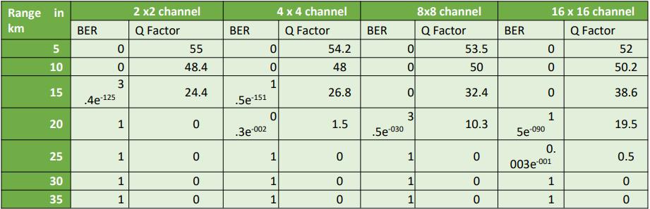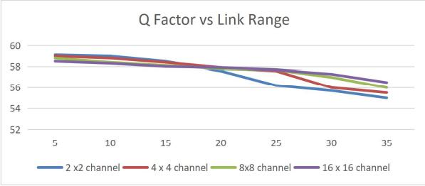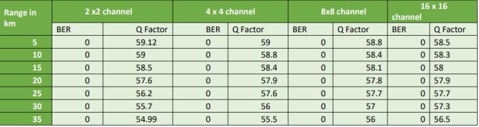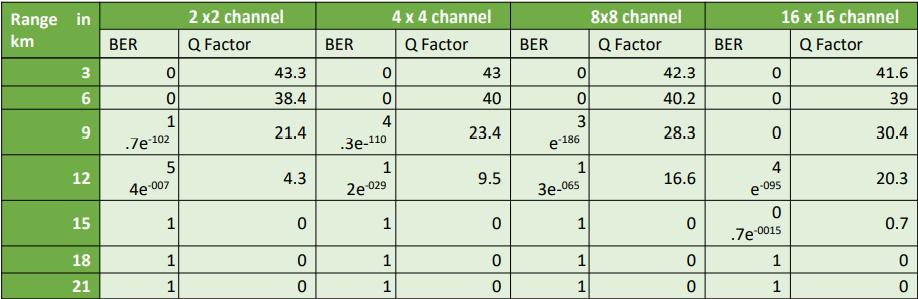 It shows that, the use of adaptive optimized channel increasestheQfactorvalueofabout30in2x2channeland withtheincreaseinlinkrange,16x16channelsshowsbest transmissionrateincomparisontootherMIMOchannels.