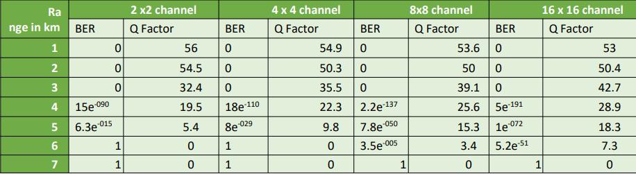 It shows that, the use of adaptive optimized channel increasestheQfactorvalueofabout55in2x2channeland withtheincreaseinlinkrange,16x16channelsshowsbest transmissionrateincomparisontootherMIMOchannels.