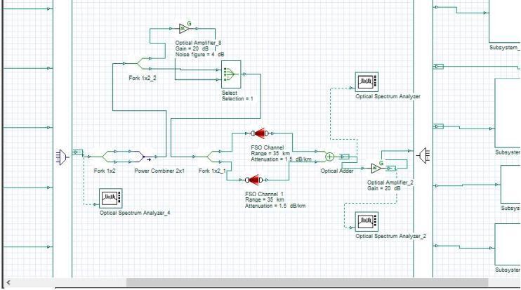 TheFSOsystemisnotmuchdifferentfromfiberoptic communication where the difference relies in the propagation medium. In the Optisystem 16 software, the FSO channel is model between an optical transmitter and optical receiver where the attenuation takes place. The adaptivechannel optimizationisachievedwiththehelpof a switch circuit that chooses the path which has inline amplifier that activates the amplifier circuit based on the visibility of the channel, thus optimizing the channels performance byadaptive optimization. Attenuation occurs due to presence of different atmospheric disturbances in the channel that is analyzed by considering standard attenuationvaluesfordifferentatmosphericcondition.