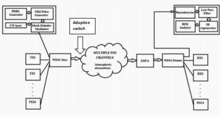 The four models of FSO links are four different number of channels (2x2,4x4,8x8,16x16) operating at a wavelength of 1550nm by using different modulation formats i.e. NRZ and RZ. The FSO system consists of transmitter, propagation medium and receiver which is shown in fig. 3. The free space channel between the transceiver is the propagation medium that is use to transmit the light signal. Optical wireless communications useslightatnearinfraredfrequencytocommunication.