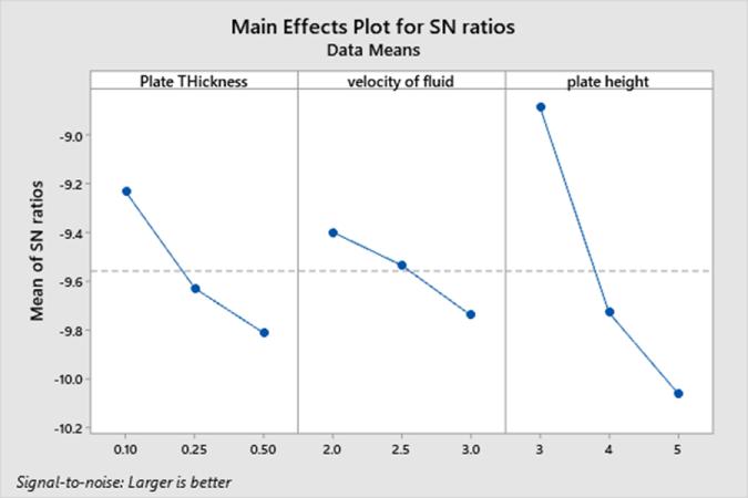 The results of Taguchi obtained are given below. Accordingtothe9modelsmadeandbasedontheTaguchi analysisfromMINITAB2019,themodelwiththecofactors which is 0.10mm plate thickness, 2 m/s velocity of fluid and3mmofplateheight.Andtheresponsetableforsignal tonoiseratioinwhichlargerisbetterwasconsidered,the rank was given in the follo9wing order; A to plate thickness,BtovelocityofthefluidandCtoplateheight.