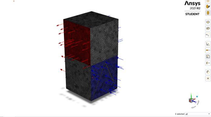 In this problem there is inlet one for cool stream and otherforhotsteam,throughthecrosssectionofcore.Both streams are separated by each other by an intermediate plate and both are velocity inlet type. Similarly, there are two outlets in which are pressure outlet type the cross sectionisgivenassymmetrytypeandremainingarekeep as a wall which are smooth, no slip and adiabatic. The velocity at both the inlet is 2 m/s. the pressure at the outletisoneatmosphere.