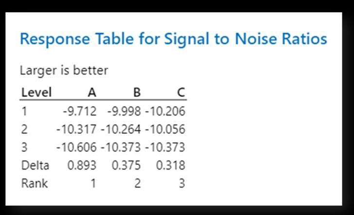 Figure 3: Response table for S/N ratios